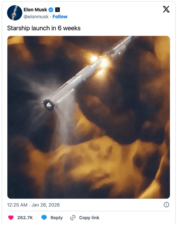 | Days before Blue Origin's announcement, Elon Musk posted the following on X, indicating the first launch of Starship version 3 will arrive as early as March 9… |