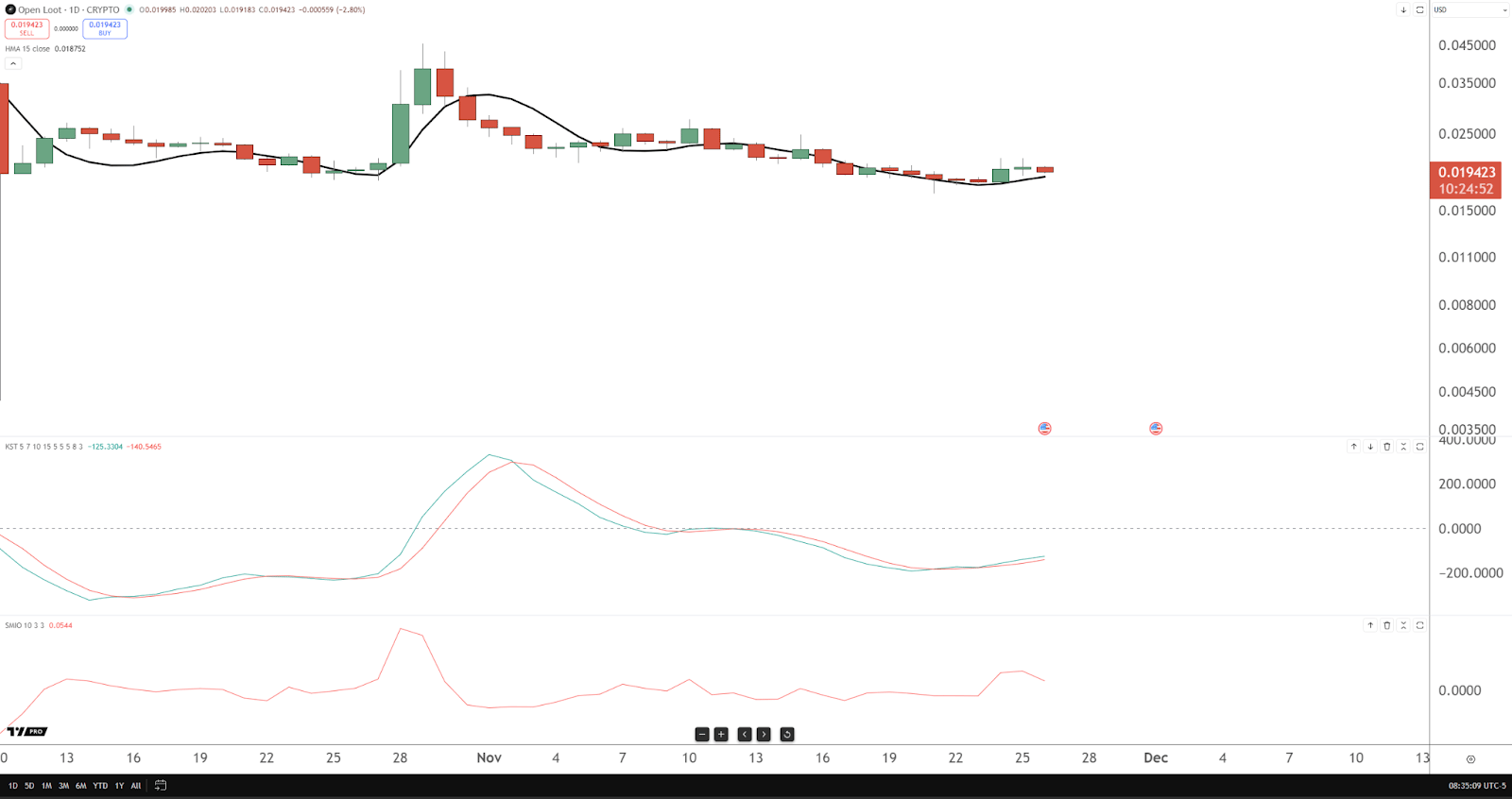 Trend: Slow but controlled base - HMA flattening into a neutral-to-positive curl. KST: Steady upward climb, suggesting a developing push. SMI: Mildly bullish with improving slope. Trigger: Break above 0.122 confirms rotation. Invalidation: Below 0.111.