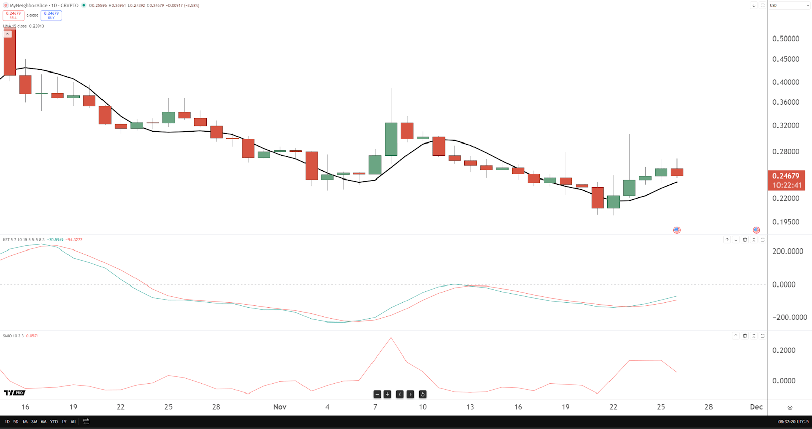 Trend: Rounded bottom forming, HMA flipping positive for the first time in weeks. KST: Crossed bullish with room to run - mid-cycle strength returning. SMI: Higher lows stacking; buyers getting more aggressive. Trigger: Daily close over 0.252 opens a clean rotation window. Invalidation: Below 0.233.