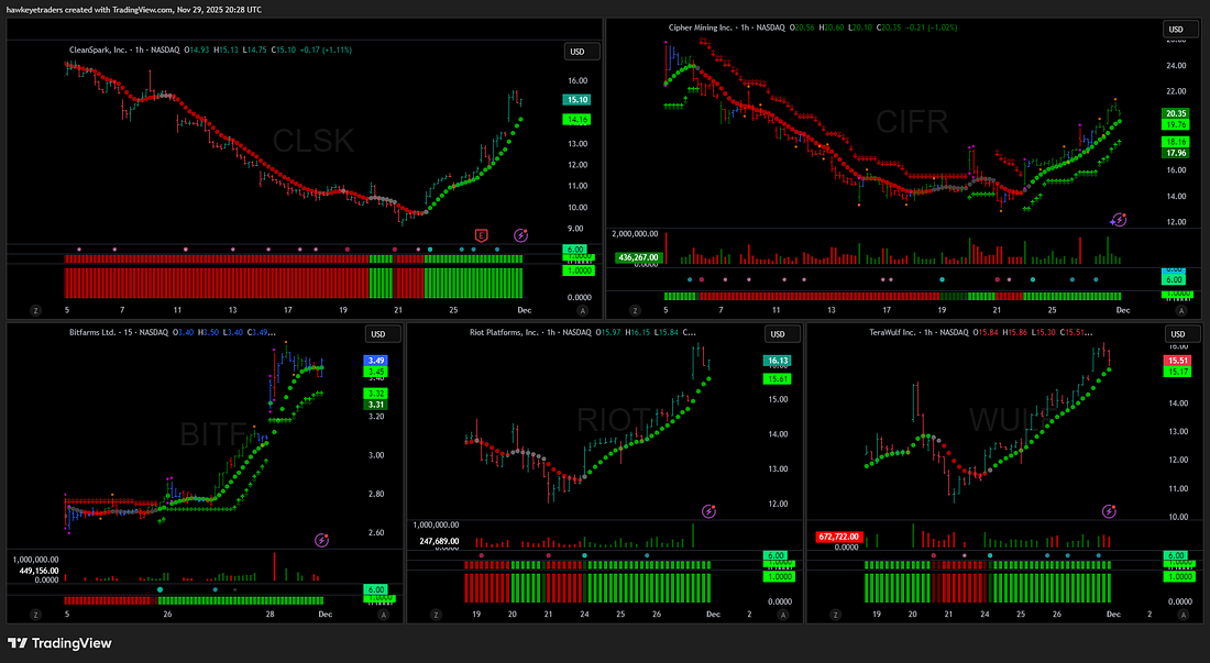 Hard assets are beginning to look like the simplest expression of two ideas at once: That is why this move matters. It is not just traders chasing shiny rocks. It is the market quietly rotating into assets that benefit if the next twelve months are defined by persistent price pressure and a weaker currency backdrop. Bitcoin’s Hangover Rally And The Miner StampedeOn the surface, crypto still looks messy. Bitcoin spent November in a violent 31 percent drawdown, falling from its earlier highs toward the low 80 thousands as Fed hawkishness, rising yields, and billions in liquidations hit the entire space. Miners turned into net sellers for most of the month as they raised cash and the usual commentators dusted off their obituaries. But just as the narrative turned darkest, the tape flipped. Over the past several sessions Bitcoin has fought back toward the low 90 thousands, with several desks now talking about oversold conditions and the potential for a run back toward the 100 thousand level if macro conditions stabilize. That shift showed up instantly in the equity side. CleanSpark (CLSK), Cipher Mining (CIFR), Bitfarms (BITF), Riot Platforms (RIOT) and TeraWulf (WULF) all posted explosive weekly moves, with the strongest names up more than 35 to 50 percent. This was not random. JPMorgan upgraded both CleanSpark and Cipher during the week, citing higher valuations for high performance computing capacity and setting aggressive 2026 targets. Under the surface, the message is straightforward.