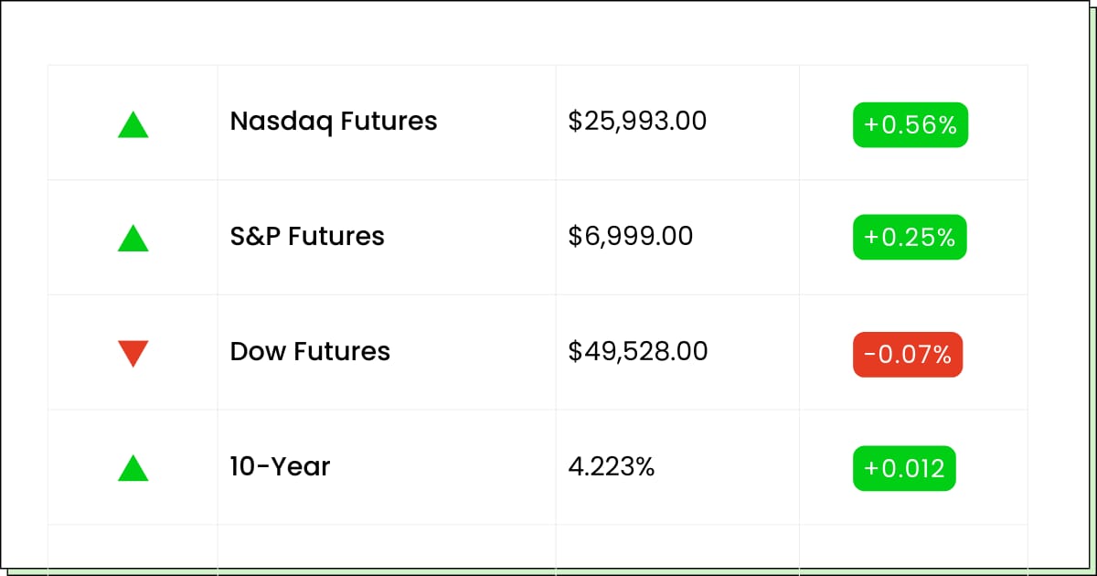 | | Futures at a Glance📈 | Futures are inching higher as Big Tech earnings week gets rolling, with traders watching if the momentum holds into the Fed decision later this week. Tech is doing the warm-up jog, while the Dow is getting dragged by a health-insurer gut punch after the Medicare Advantage rate proposal. Tariff talk with South Korea is back in the mix too, plus today's consumer confidence and home price data as the early-week check. | |