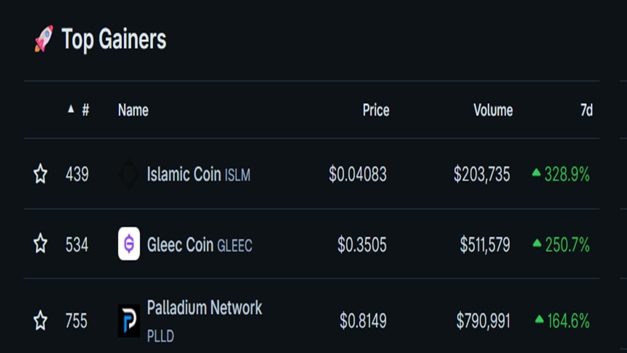 Islamic Coin (ISLM) - Surge in interest as a Shariah-compliant hedge during Middle Eastern market uncertainty saw this crypto jump 250%. |
