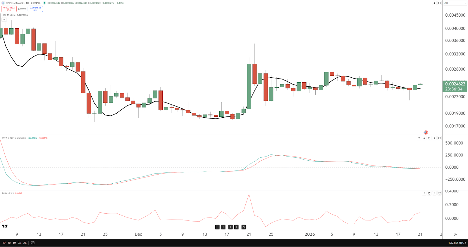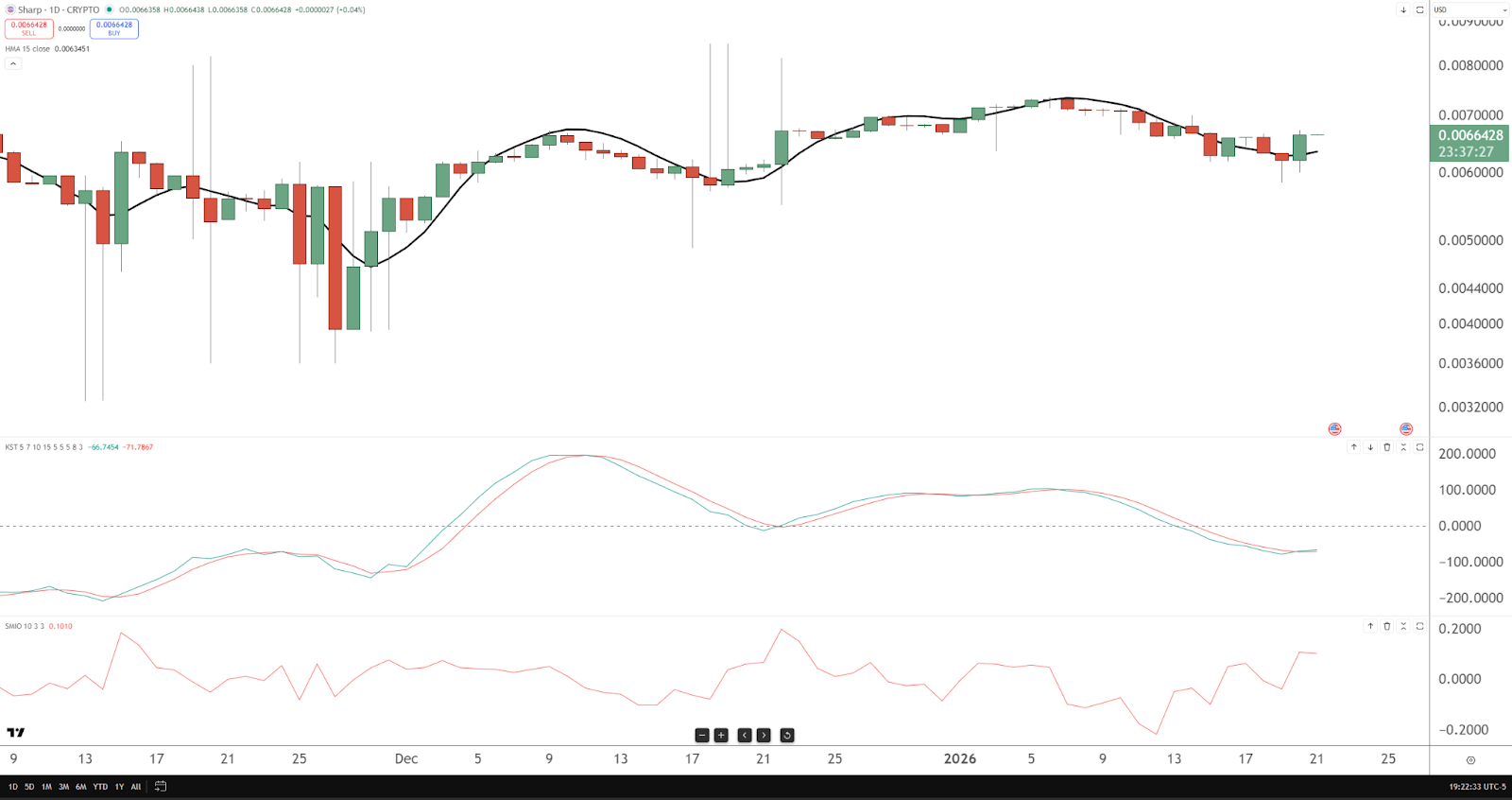 Trend Check: Prolonged downtrend transitioned into a flat, low-energy base. Lower highs still cap it. Momentum: KST rolled over from a modest push and is drifting back toward flat. Momentum fading. SMI: Choppy around zero with no clear thrust. Setup Idea: Daily close above 0.0103 to break the range. Stops: 0.0084. Profit Zones: 0.0114 → 0.0128. This only matters if price actually leaves the couch.