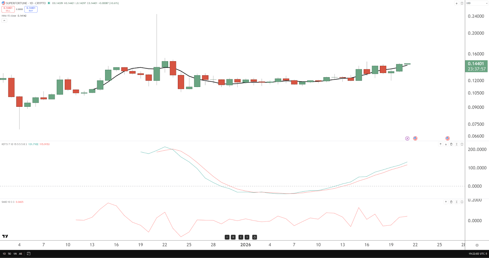 Trend Check: Higher lows forming after a volatile shakeout. Structure quietly improving. Momentum: KST rising with a clean positive slope. Buyers still leaning in. SMI: Holding positive territory despite noise. Setup Idea: Daily close above 0.150 to extend the rotation. Stops: 0.126. Profit Zones: 0.168 → 0.192. One of the few charts here that looks awake.