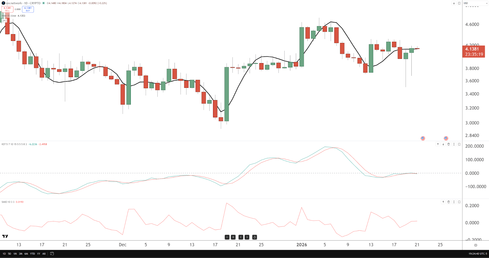 Trend Check: Higher low printed after a sharp pullback. Structure trying to stabilize. Momentum: KST flattened near zero after a full unwind. Sellers stepped aside. SMI: Recovering from oversold with uneven strength. Setup Idea: Daily close above 4.45 to confirm rotation. Stops: 3.75. Profit Zones: 4.95 → 5.45. Tradeable again, but only with discipline.