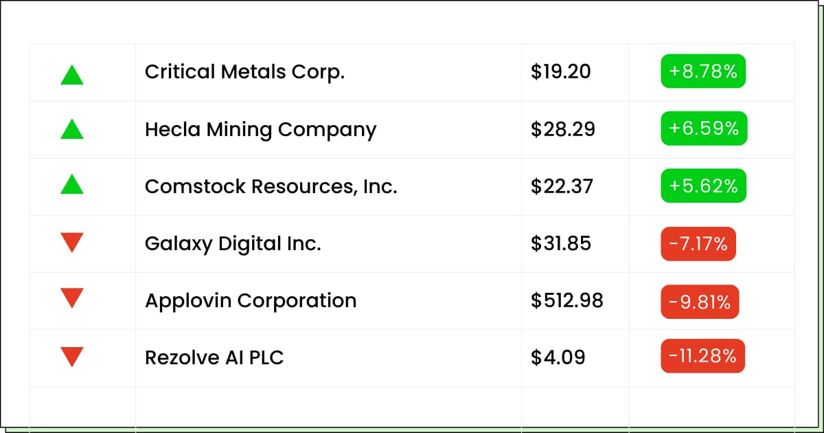 | Hecla Mining Co [HL]: Premarket Move: +6% | Gold and silver are back in main-character mode, and HL is acting like it just found a fresh vein in the couch cushions. Add in the MidCap 400 inclusion glow-up and you've got a stock that can levitate on headlines longer than you think. | But this is still a metals trade at heart, and those can flip fast when the fear meter cools or the dollar flexes. | My Take: Ride it if you're already in, but pay yourself on strong pops. If you're not in, wait for a dip day or a calmer entry instead of buying the top of the excitement. |