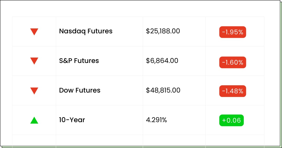 | | Futures at a Glance📈 | Futures are sliding as Trump's Greenland tariff threats crank up trade anxiety, with Europe floating counterpunches. After the long weekend, markets are finally pricing the headlines, while traders wait for earnings to steal the spotlight again. | |
