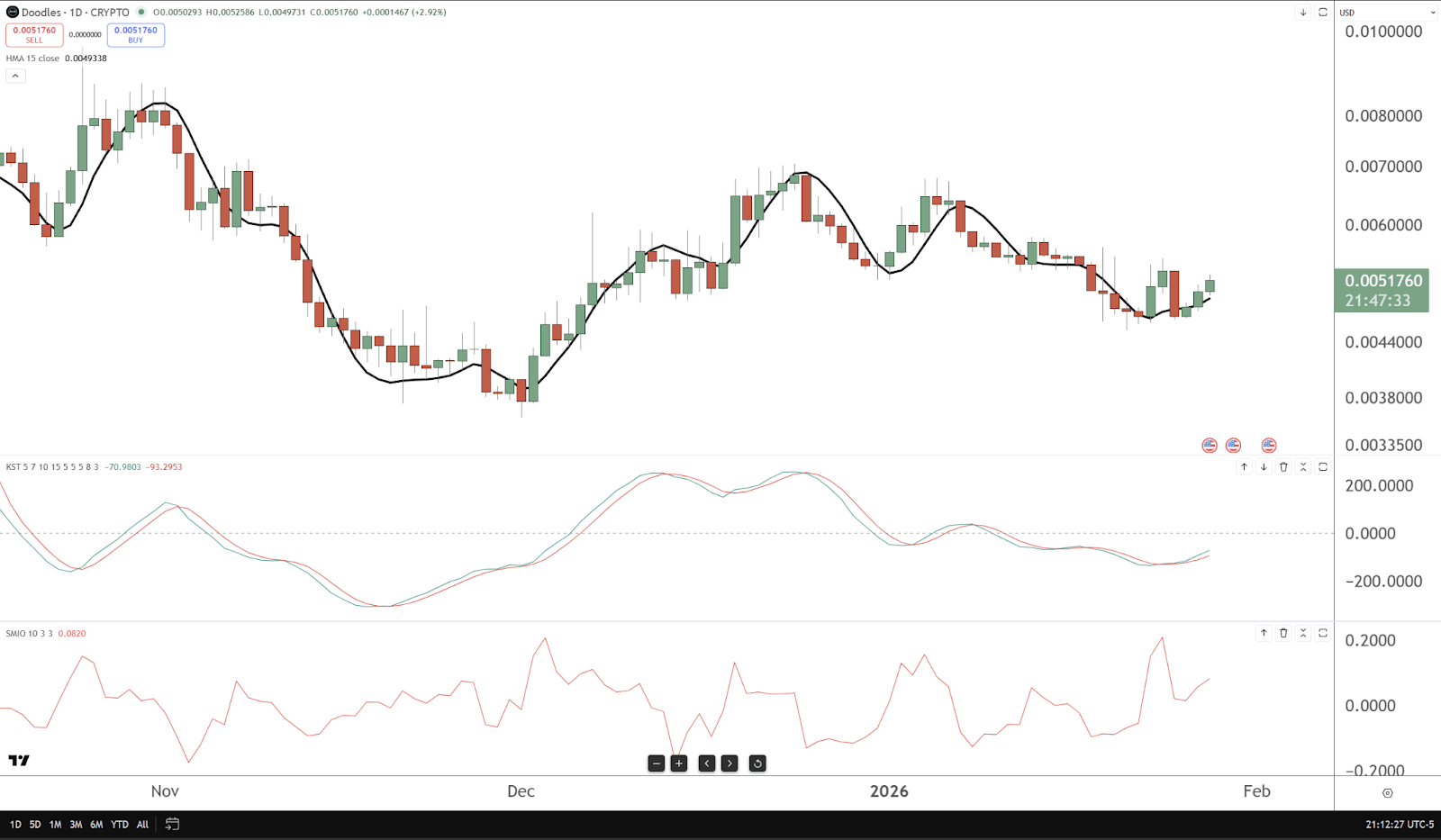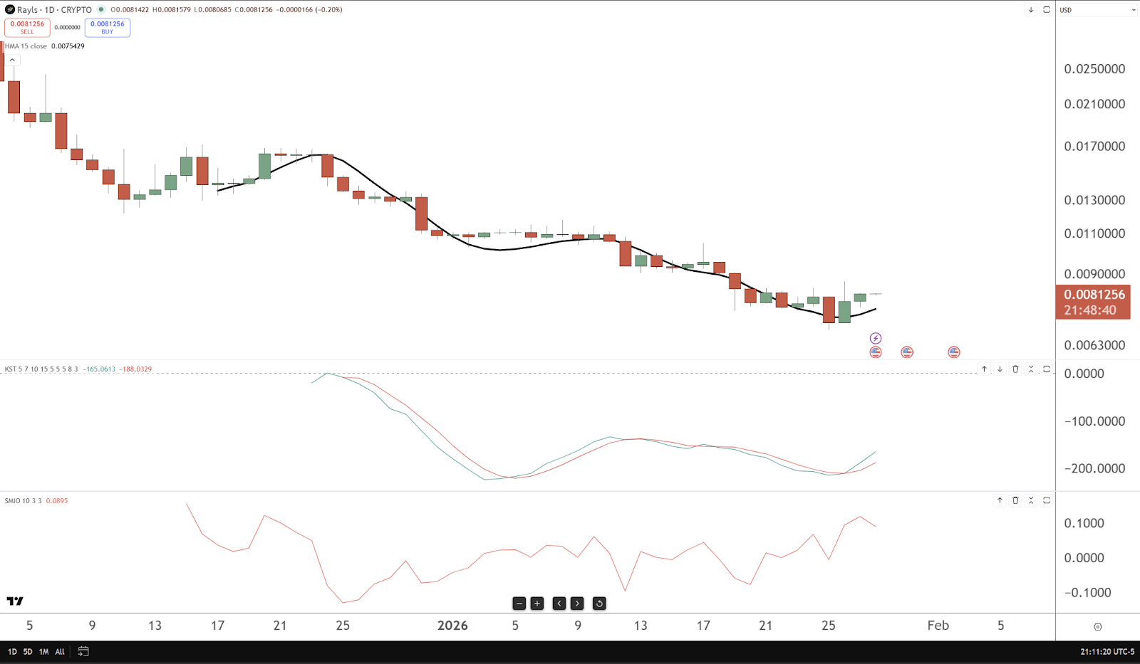 Trend Check: Rounded base forming after a volatile cycle, higher lows holding. Momentum: KST rolled over but is stabilizing near zero, mixed but not bearish. SMI: Improving with higher swings, suggesting accumulation. Setup Idea: Daily close above 0.00590 to reclaim range highs. Stops: 0.00495. Profit Zones: 0.00660 → 0.00730. Quiet strength compared to peers.
