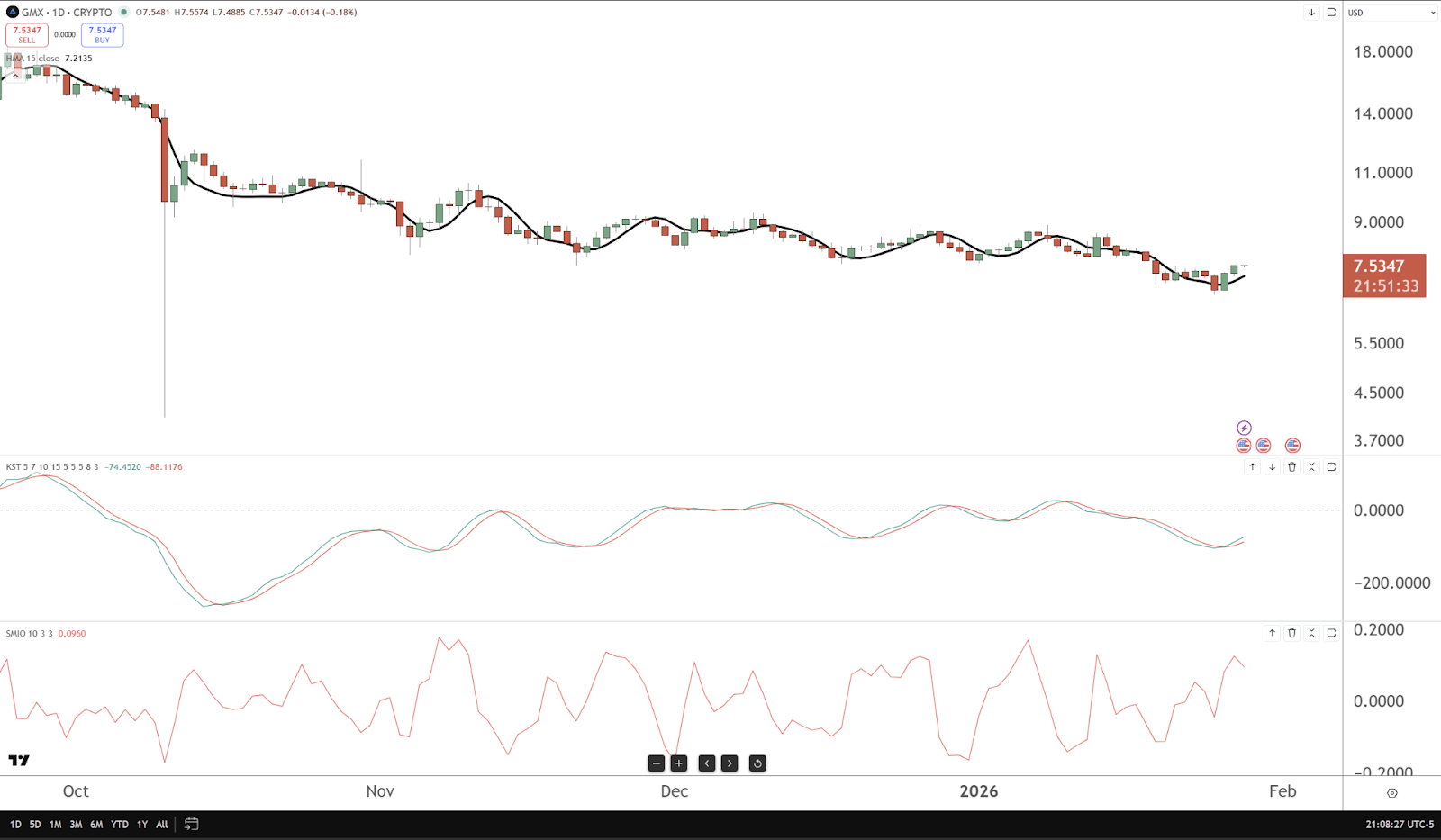 Trend Check: Prolonged downtrend that's flattened into a loose base with shallow lower highs. Momentum: KST remains negative but the slope is flattening, suggesting sellers are tiring rather than panicking. SMI: Choppy but lifting off recent lows, more stabilization than strength. Setup Idea: Needs a daily close above 7.90 to force a structural shift. Stops: 7.10. Profit Zones: 8.60 → 9.40. This is repair work, not a trend reversal.