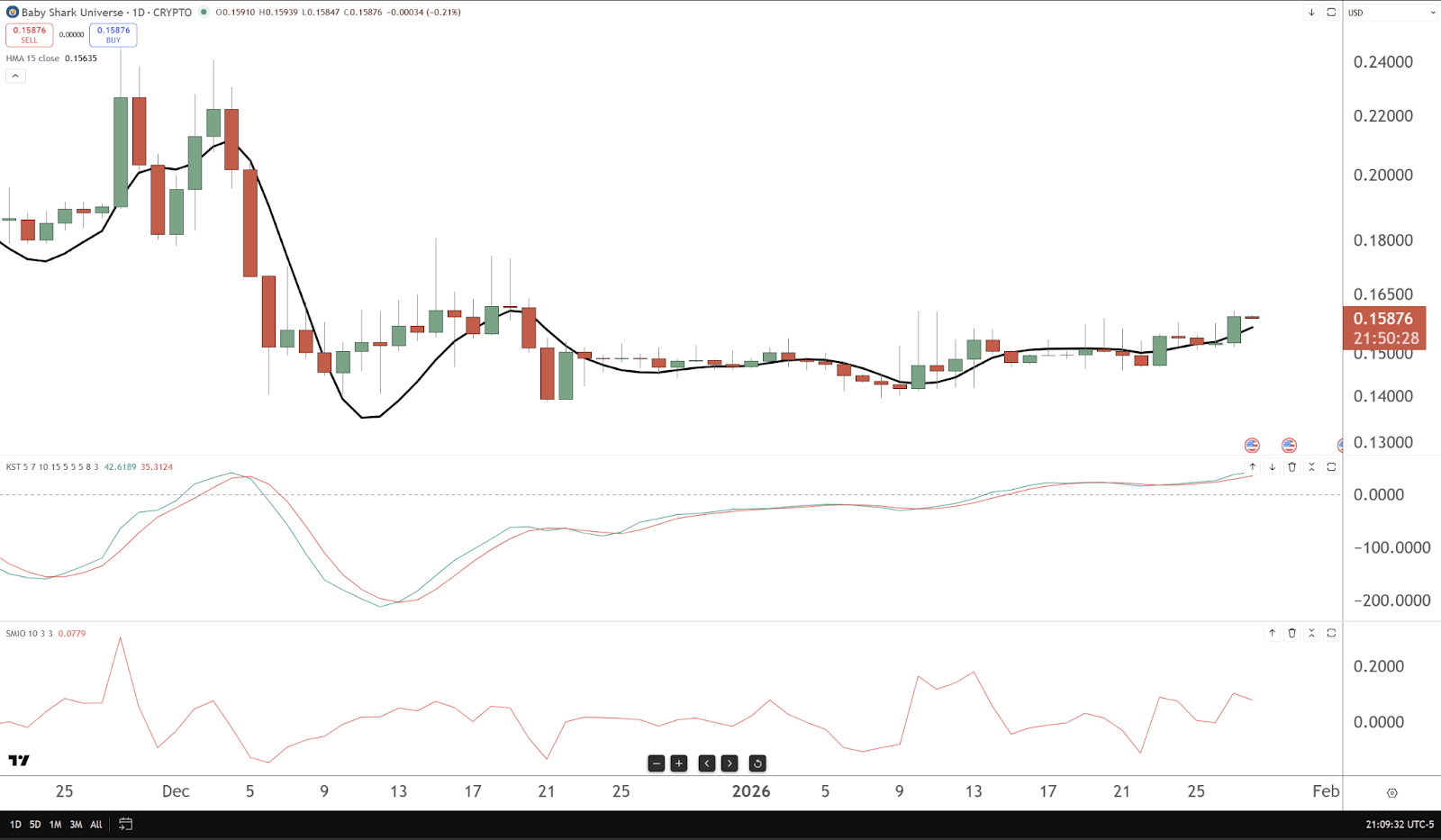 Trend Check: Sharp dump followed by a slow grind higher, printing higher lows into resistance. Momentum: KST is curling upward and approaching zero, momentum is rebuilding cautiously. SMI: Improving and holding above its midpoint, confirming the grind. Setup Idea: Daily close above 0.162 to confirm continuation. Stops: 0.148. Profit Zones: 0.178 → 0.195. One of the cleaner recoveries in this group.