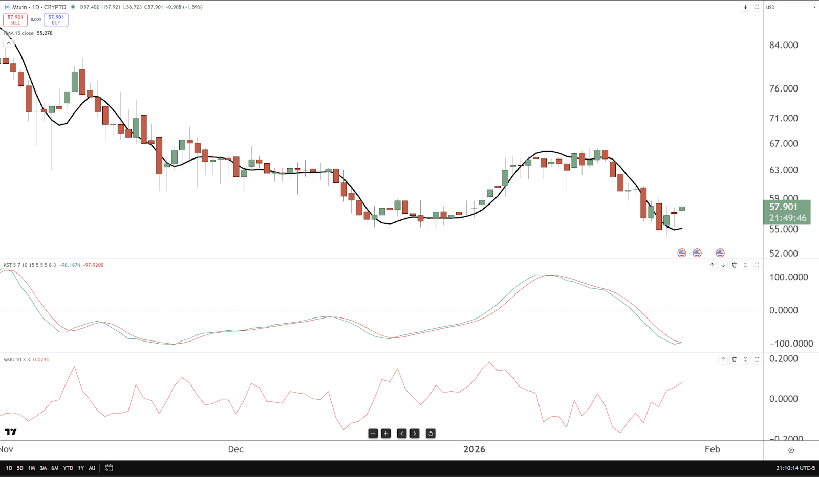 Trend Check: Range-bound after a steep decline, carving a base with repeated support tests. Momentum: KST is deeply negative but flattening, sellers losing urgency. SMI: Volatile but trending higher from oversold territory. Setup Idea: Hold above 58.00 to keep the base intact. Stops: 55.40. Profit Zones: 62.50 → 66.00. Still fragile, but no longer unraveling.