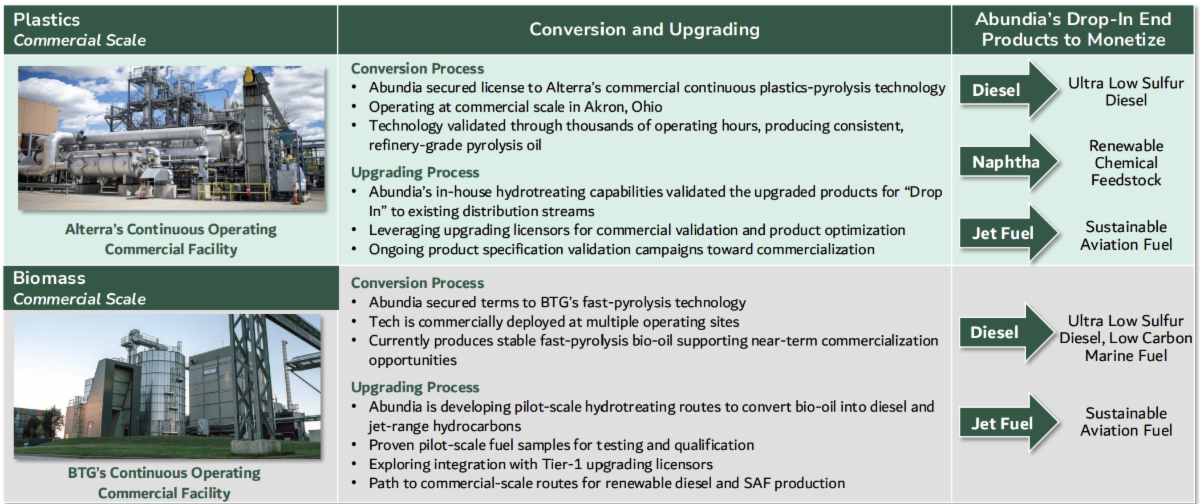 Through extensive operations at Alterra’s commercial facility, the technology platform has demonstrated strong and consistent performance across a broad range of post-consumer plastic feedstocks. Alterra’s fully continuous, catalyst-free reactor and process design using standard industrial equipment has proven its robustness by delivering high liquid yields and stable product quality that meets the requirements of downstream processors. Historically, Alterra’s technology and process designs have successfully manufactured a commercial grade liquified product that aligns with Abundia’s business focus of turning waste into high-value renewable fuels and chemical products.
