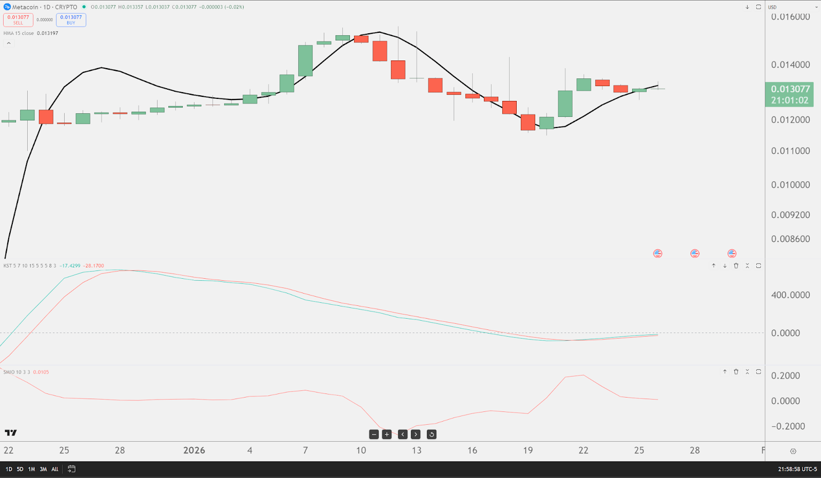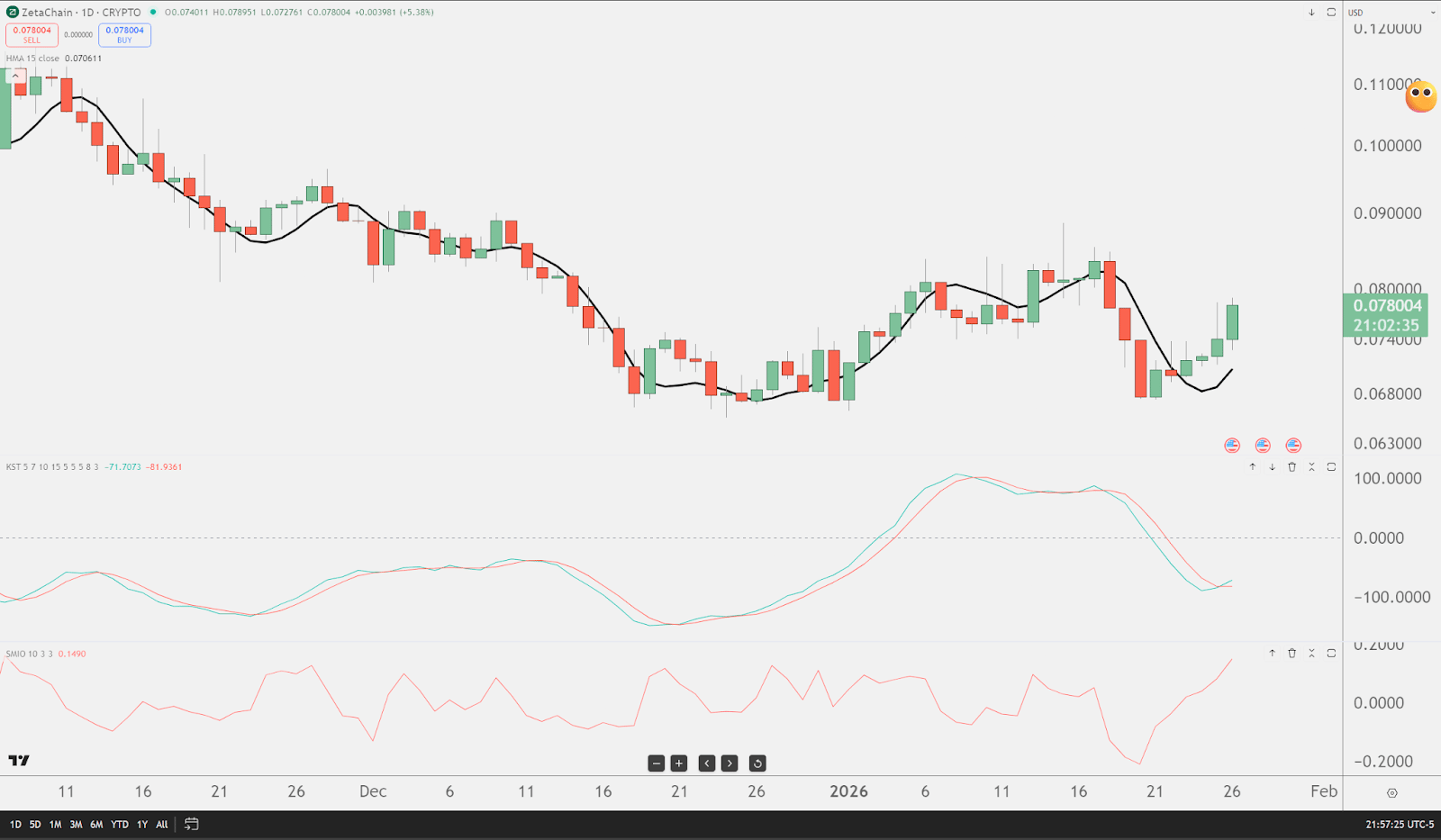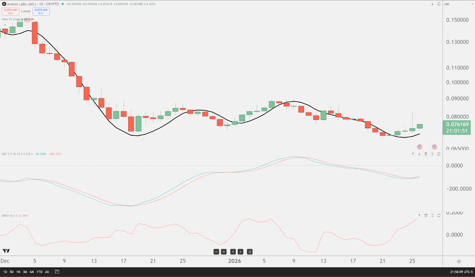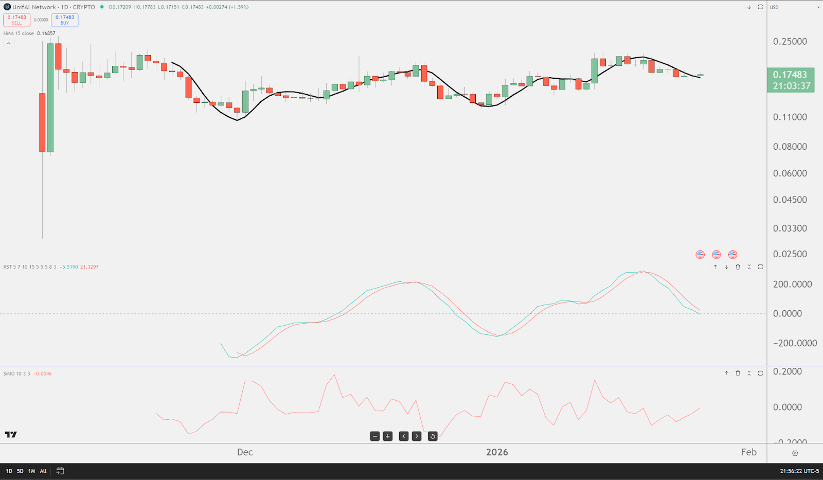 Trend Check: Sideways grind after a sharp impulse move. Higher lows intact. Momentum: KST rolled over from a peak and is drifting toward zero. Cooling phase. SMI: Sloppy but holding above negative extremes. Setup Idea: Daily close above 0.185 to reassert trend control. Stops: 0.155. Profit Zones: 0.205 → 0.230. Still constructive, just early.