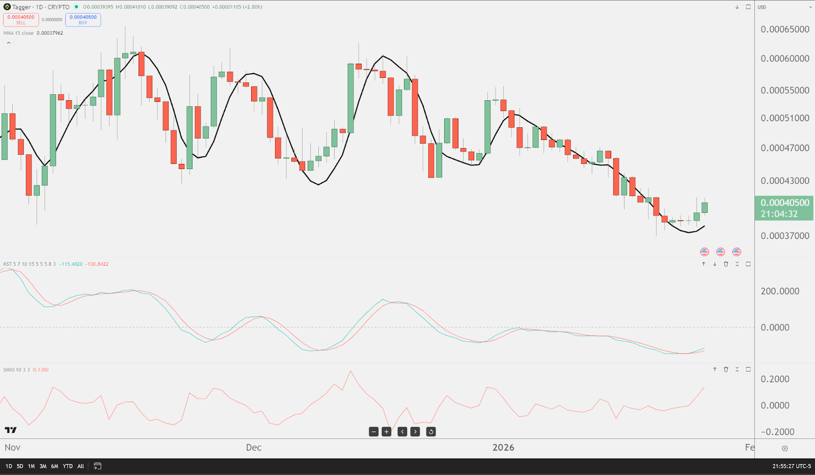 Trend Check: Rolling lower highs with a shallow bounce trying to hold. Structure still weak. Momentum: KST buried and flattening near the lows. Sellers losing urgency, not control. SMI: Lifting off the floor but uneven. Setup Idea: Daily close above 0.00045 to force a range break. Stops: 0.00037. Profit Zones: 0.00052 → 0.00060. This is stabilization, not strength.