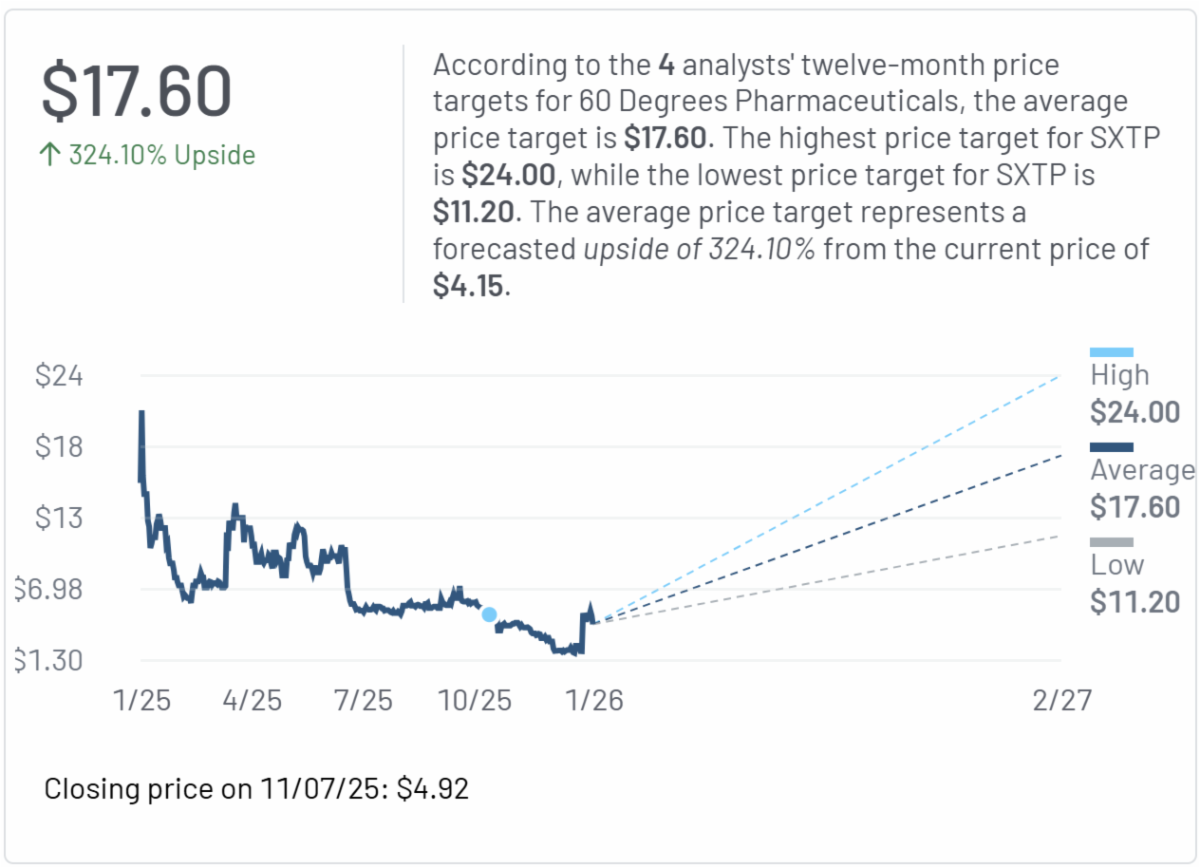 | Right now, the MarketBeat website is reporting that SXTP has 4 different analyst targets pointing towards an average target of $17.60.